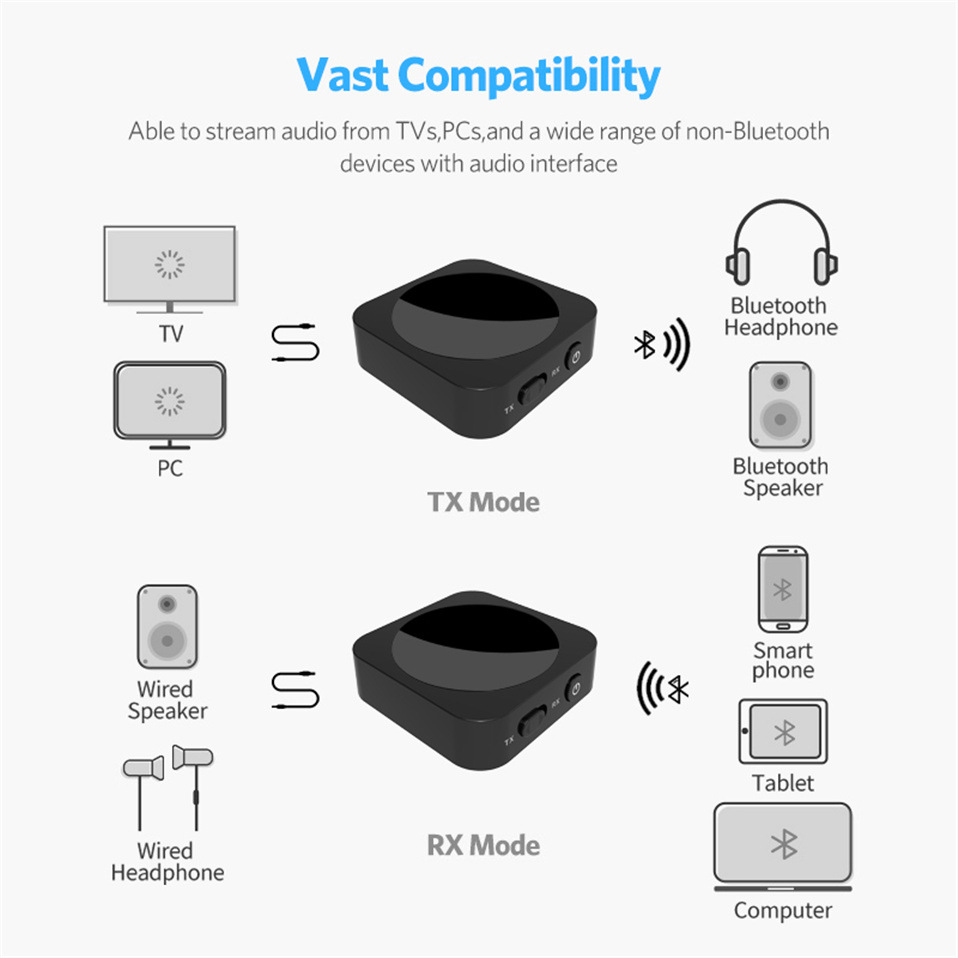 A. from non-Bluetooth audio sources(Phone, iPod, PC,eBook,MP3/MP4, CD/DVD player, TV etc.) to Bluetooth-enabled devices(BT speaker,BT headphone,BT receiver etc.)